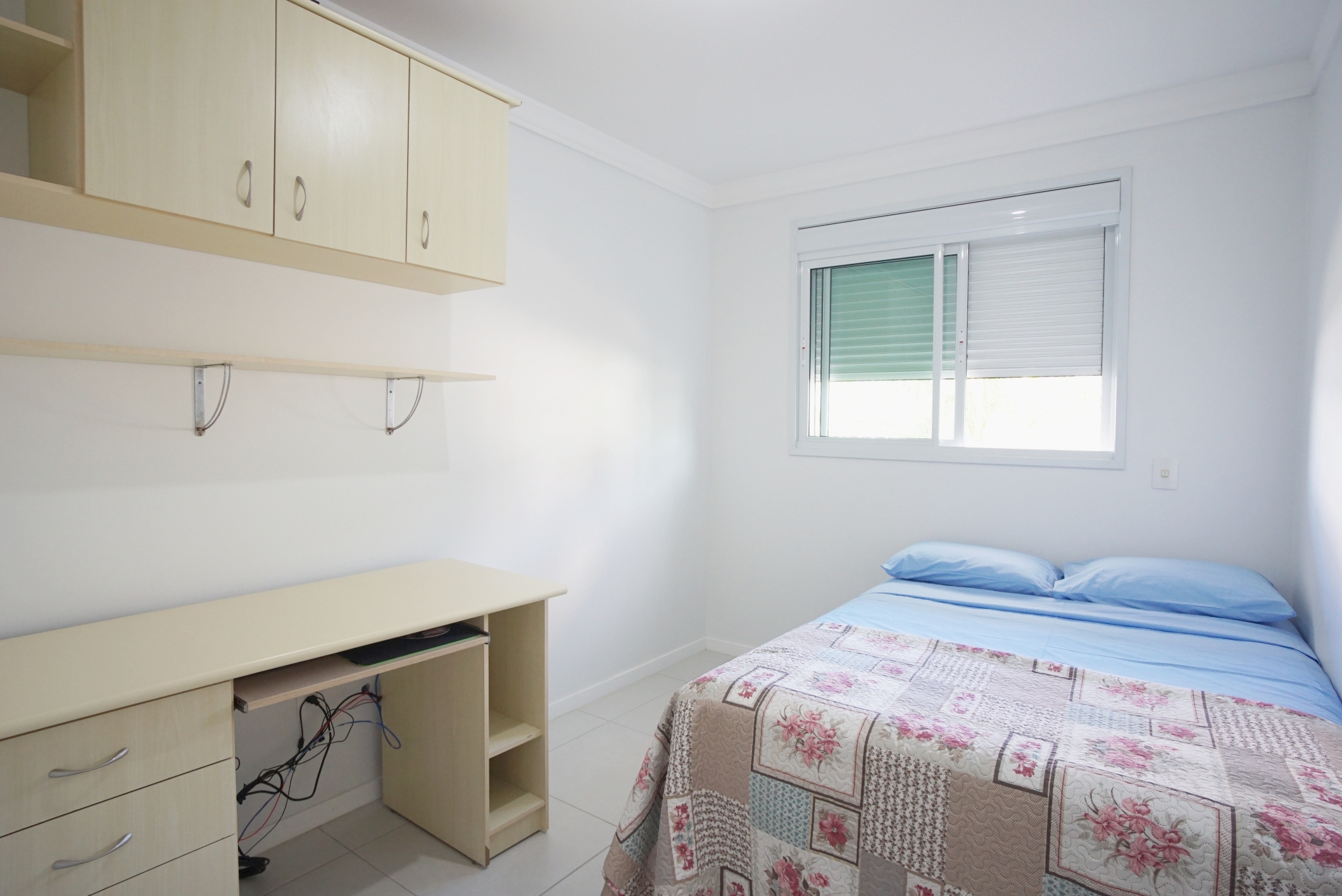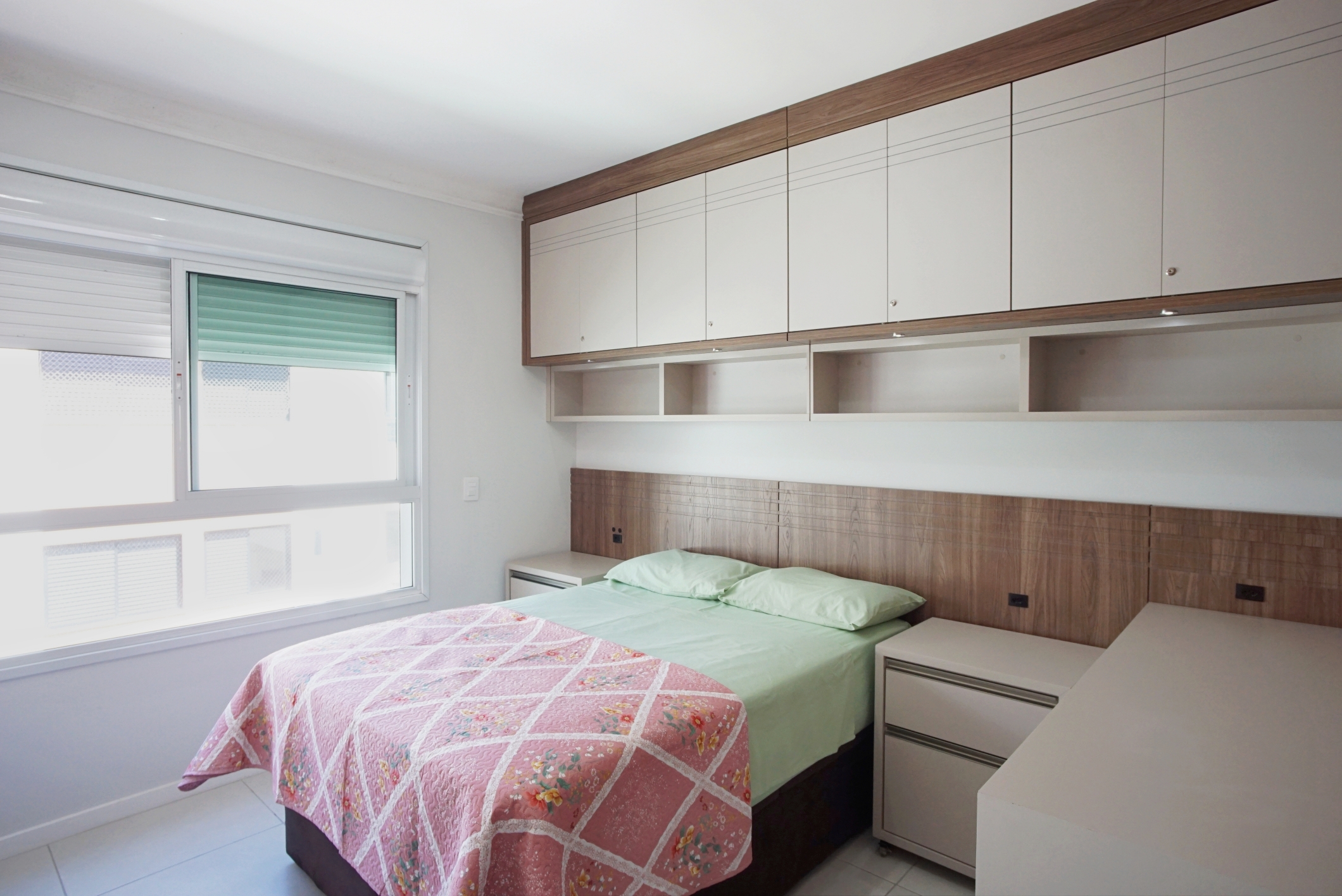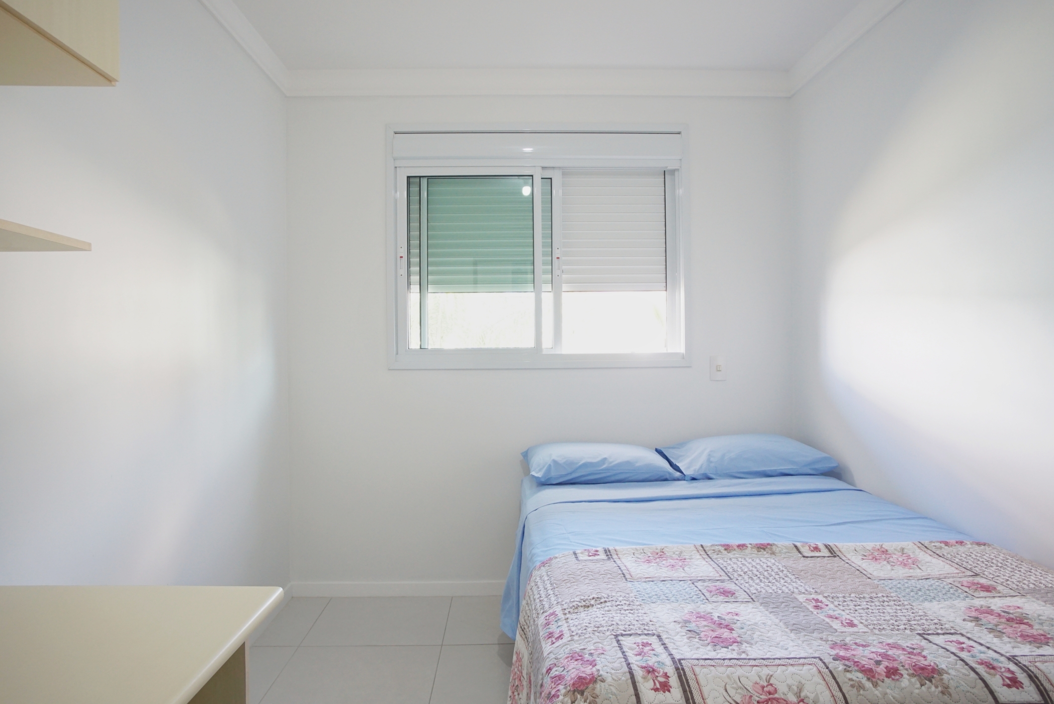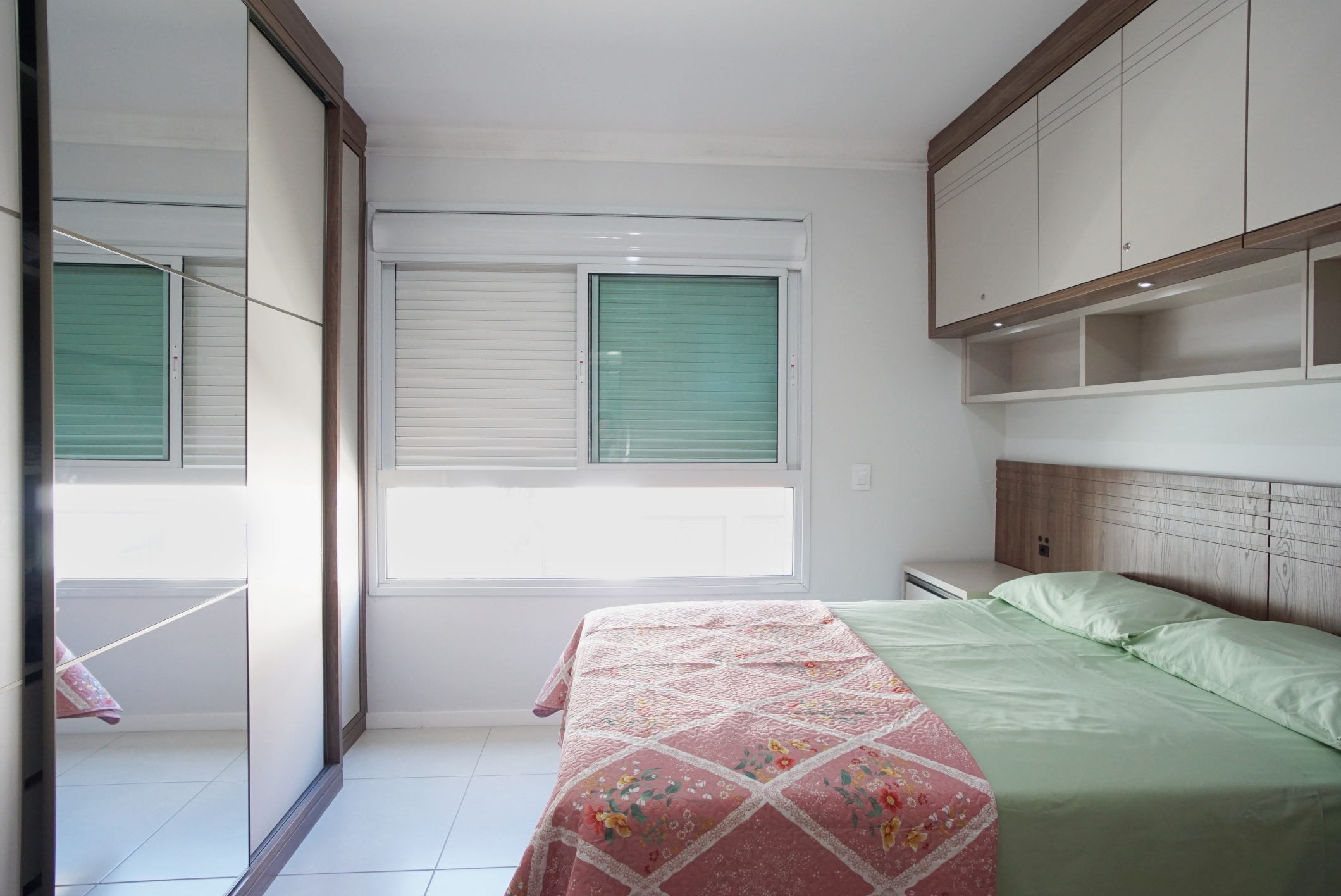 São 3 dormitórios com ar condicionado e cama de casal, sendo 1 deles a suíte (total de 2 banheiros completos).