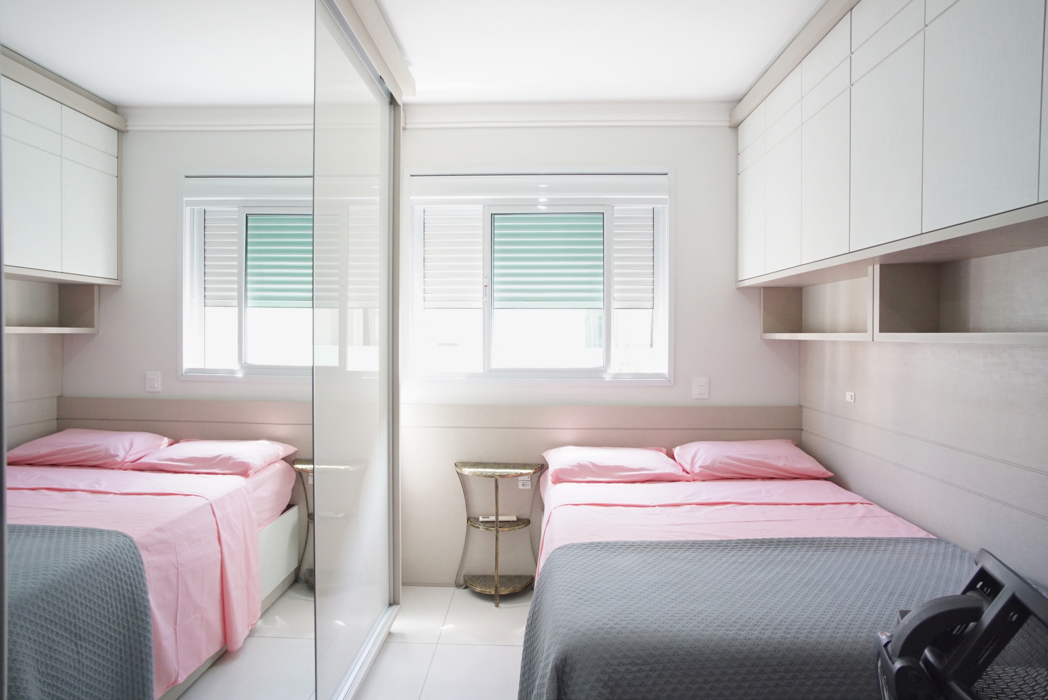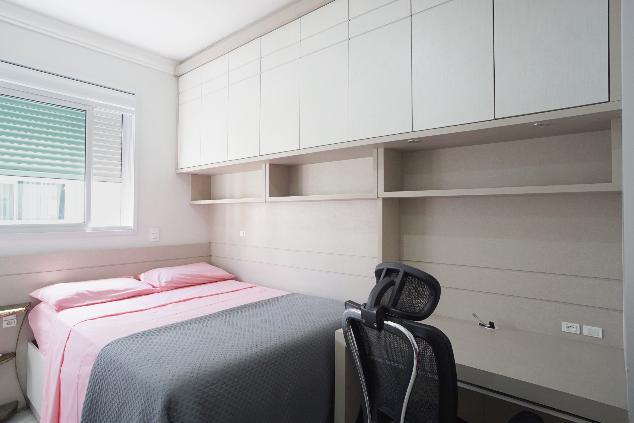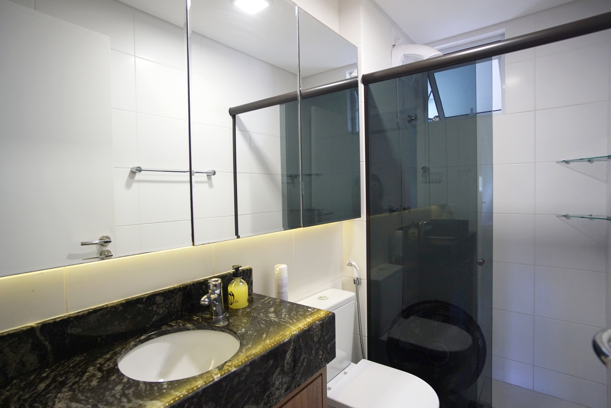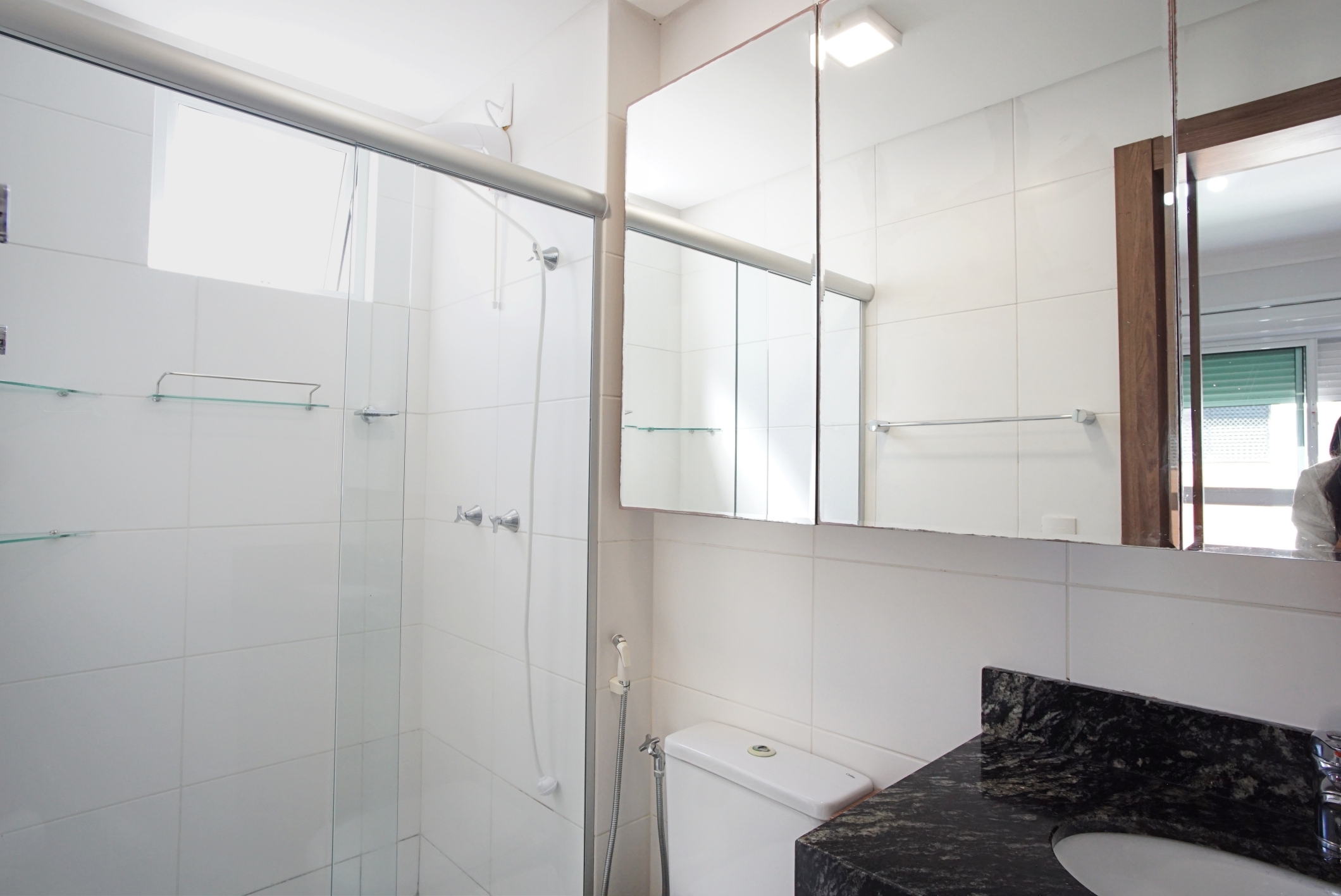 São 3 dormitórios com ar condicionado e cama de casal, sendo 1 deles a suíte (total de 2 banheiros completos).