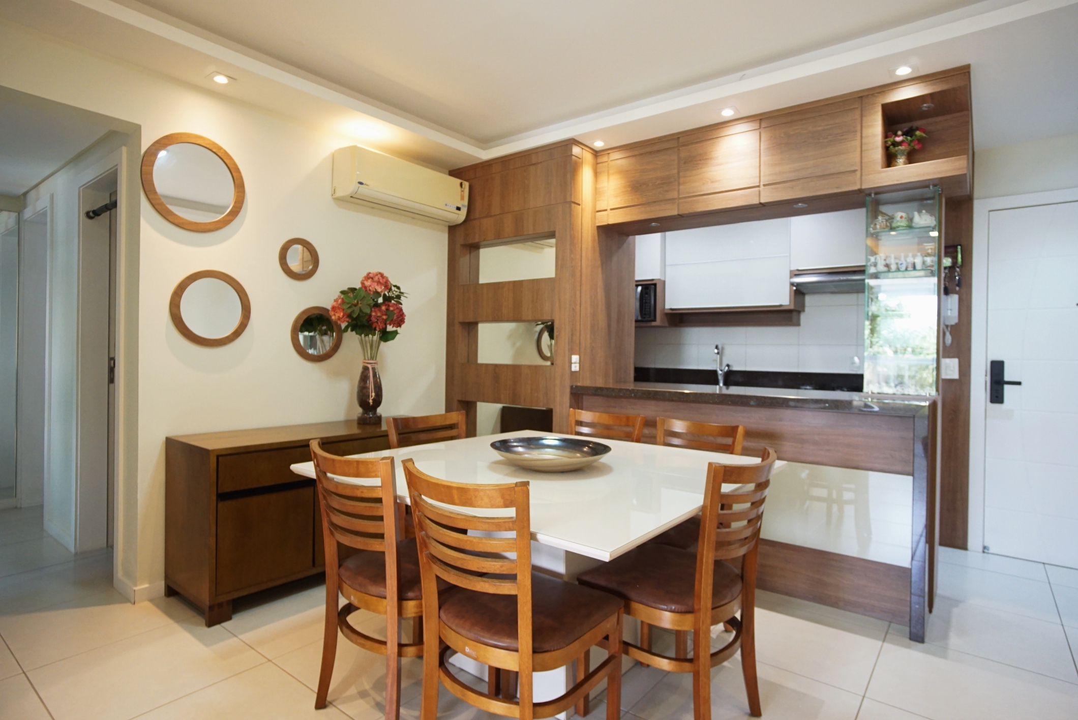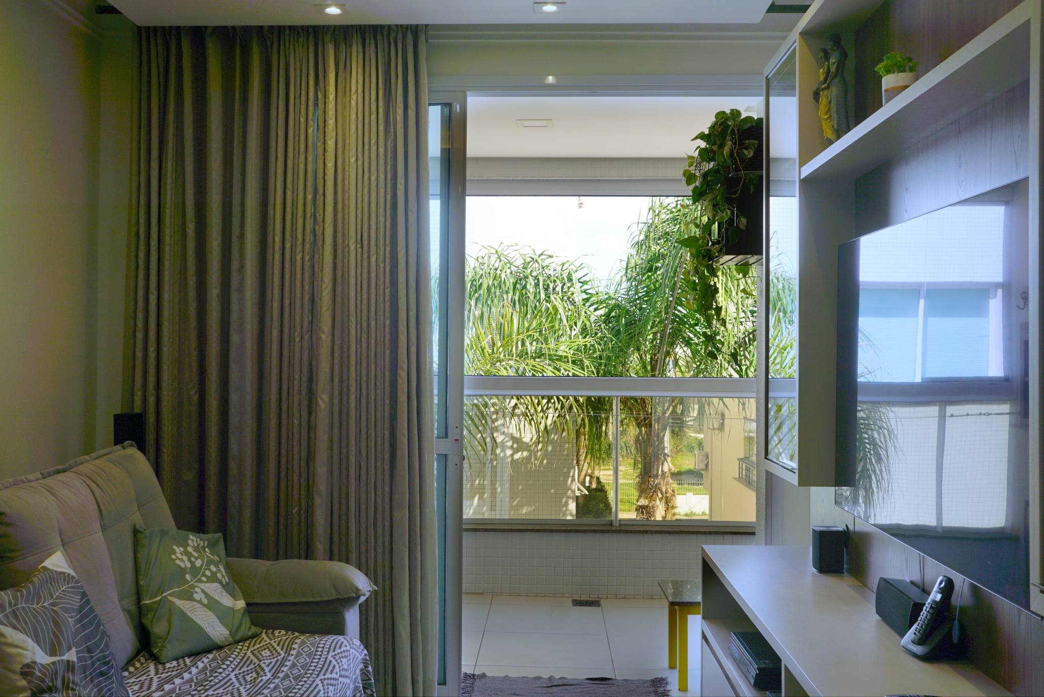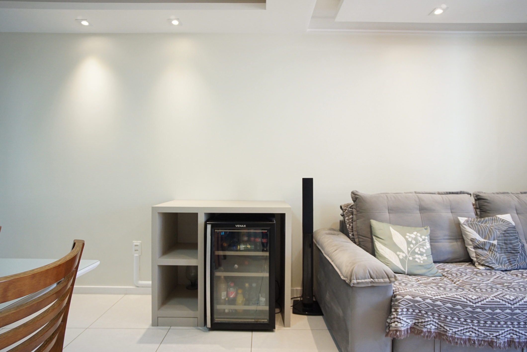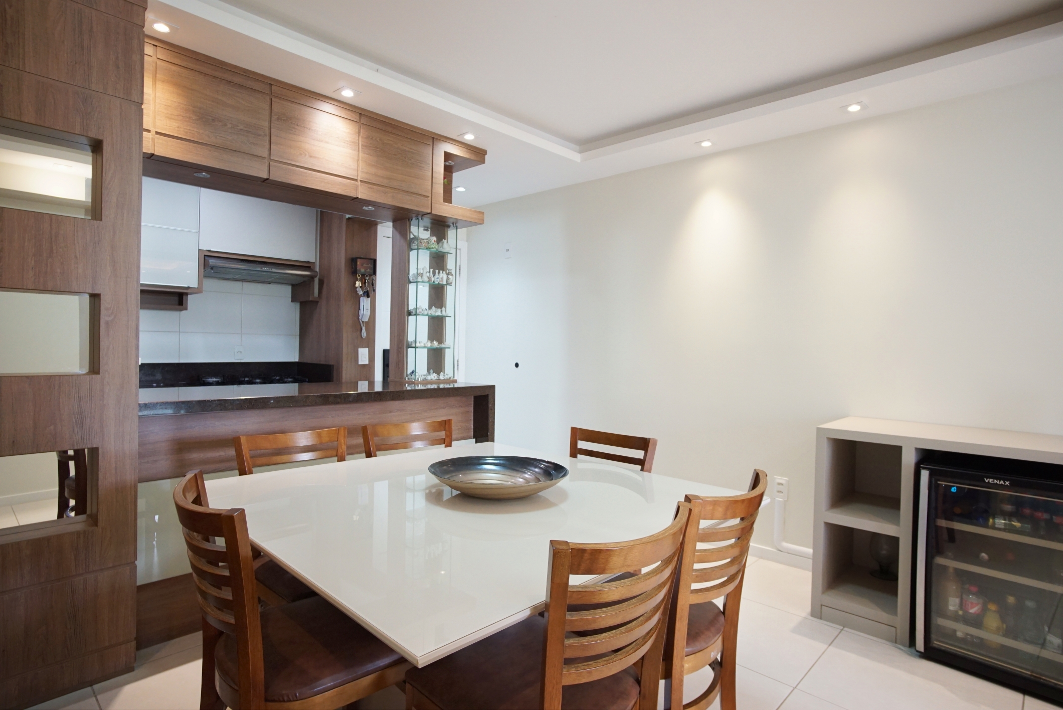 Apartamento possui sala de estar com TV a cabo, wi-fi, mesa de jantar e cervejeira. Sacada com churrasqueira e fechamento com vidros.