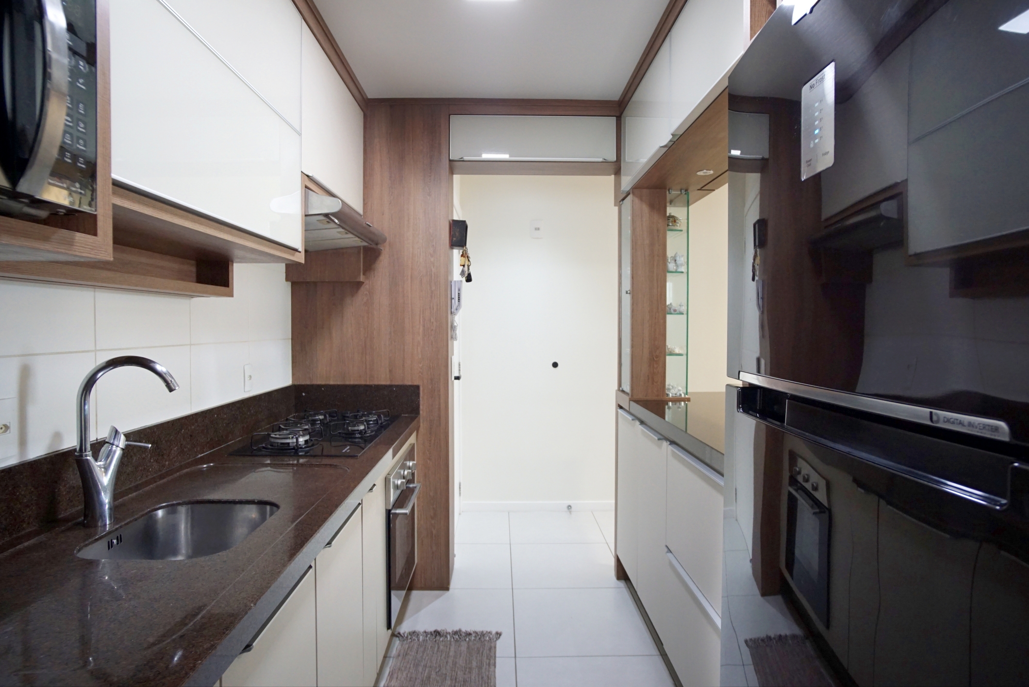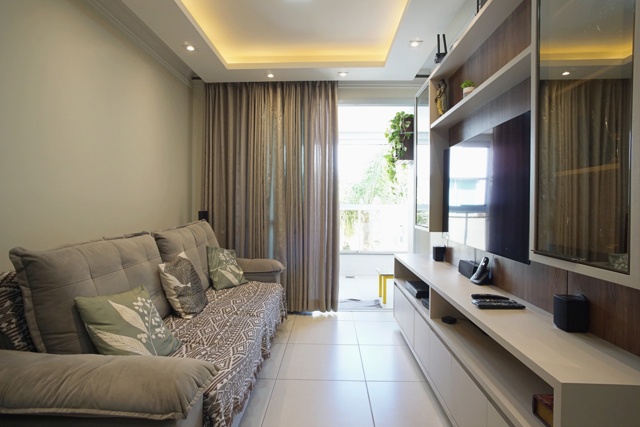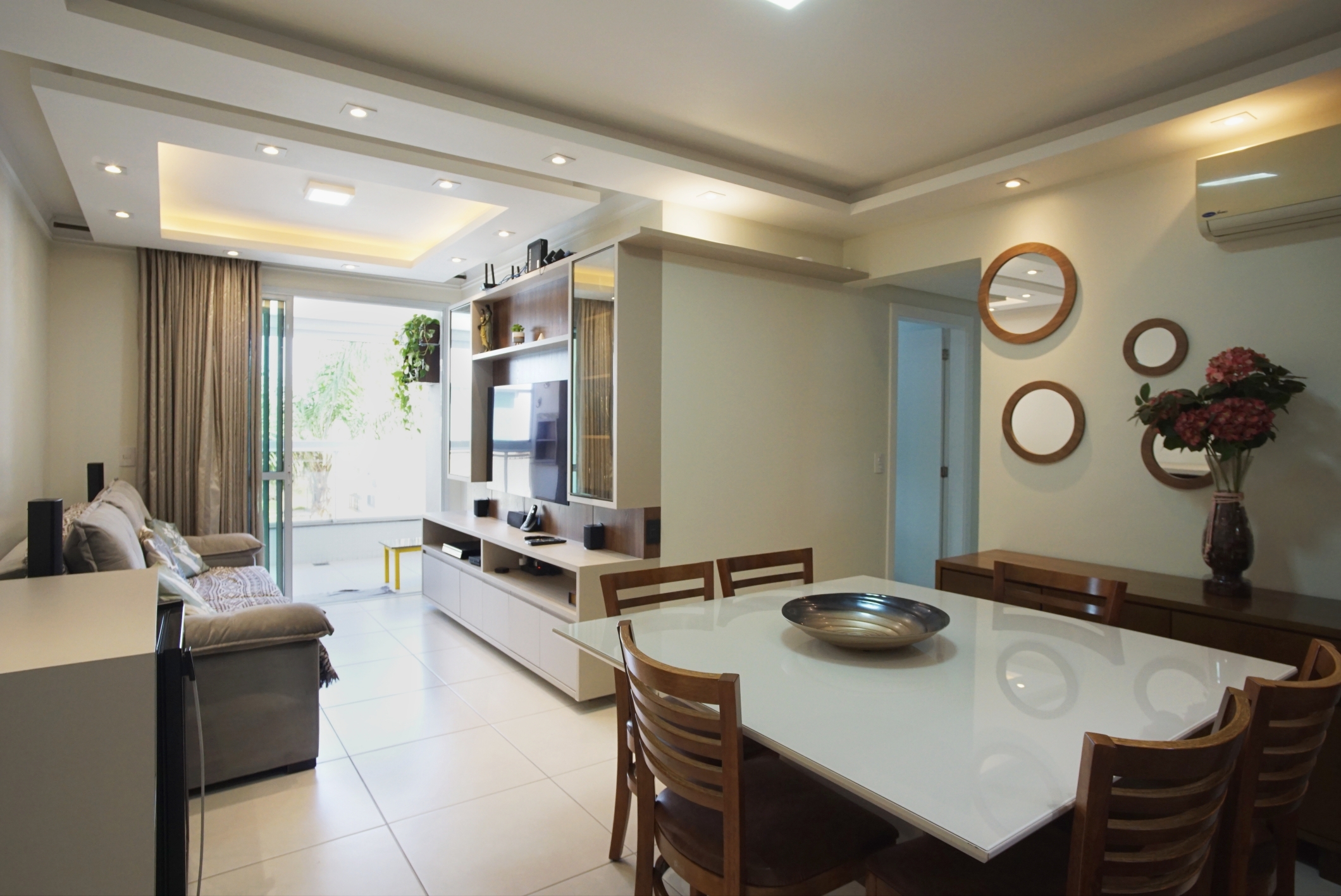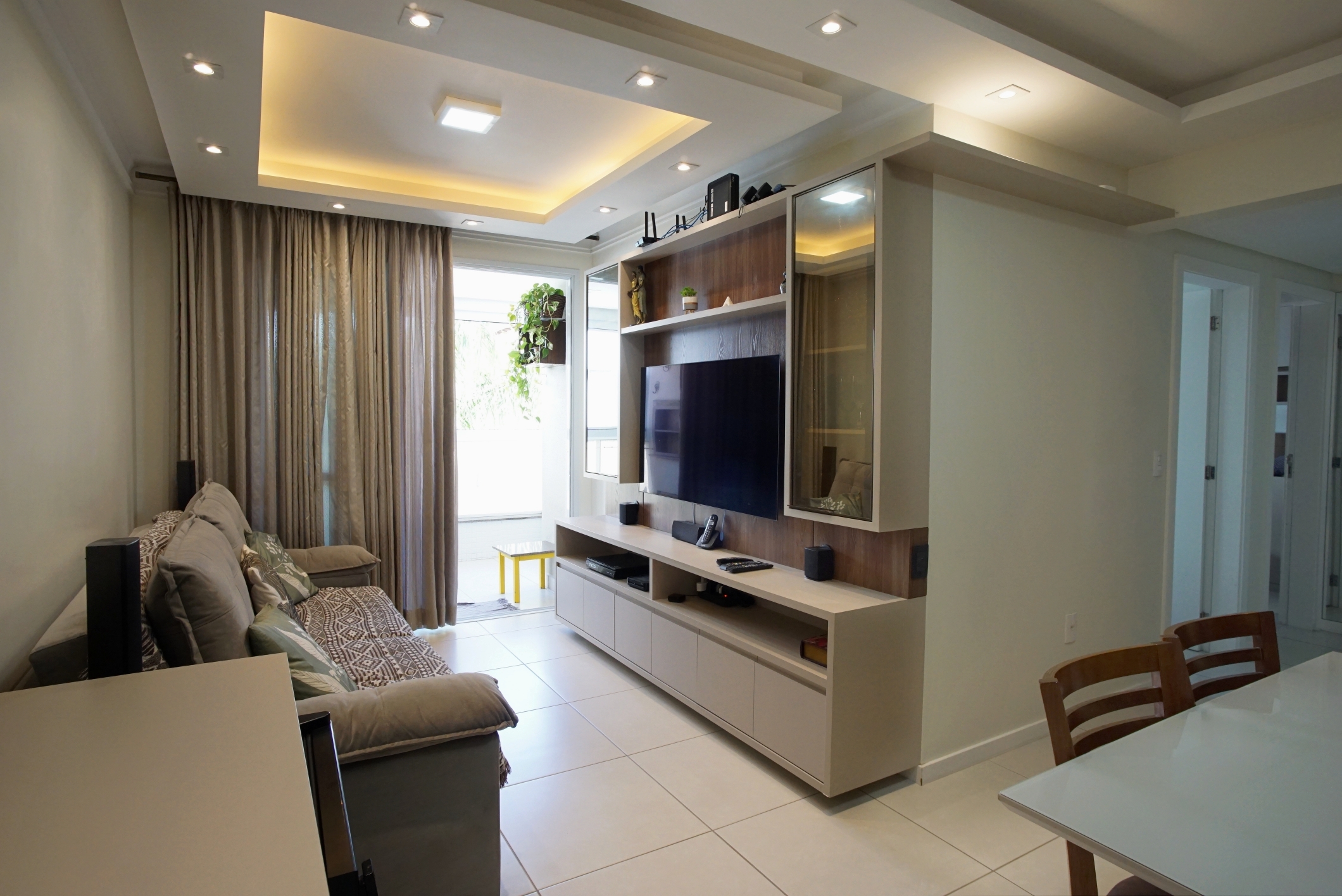 Apartamento possui sala de estar com TV a cabo, wi-fi, mesa de jantar e cervejeira. Sacada com churrasqueira e fechamento com vidros.