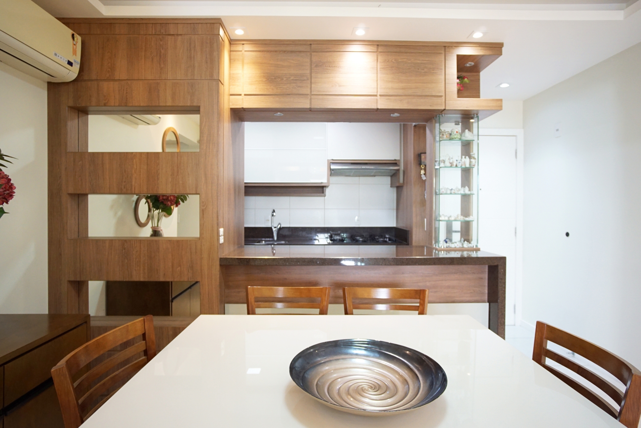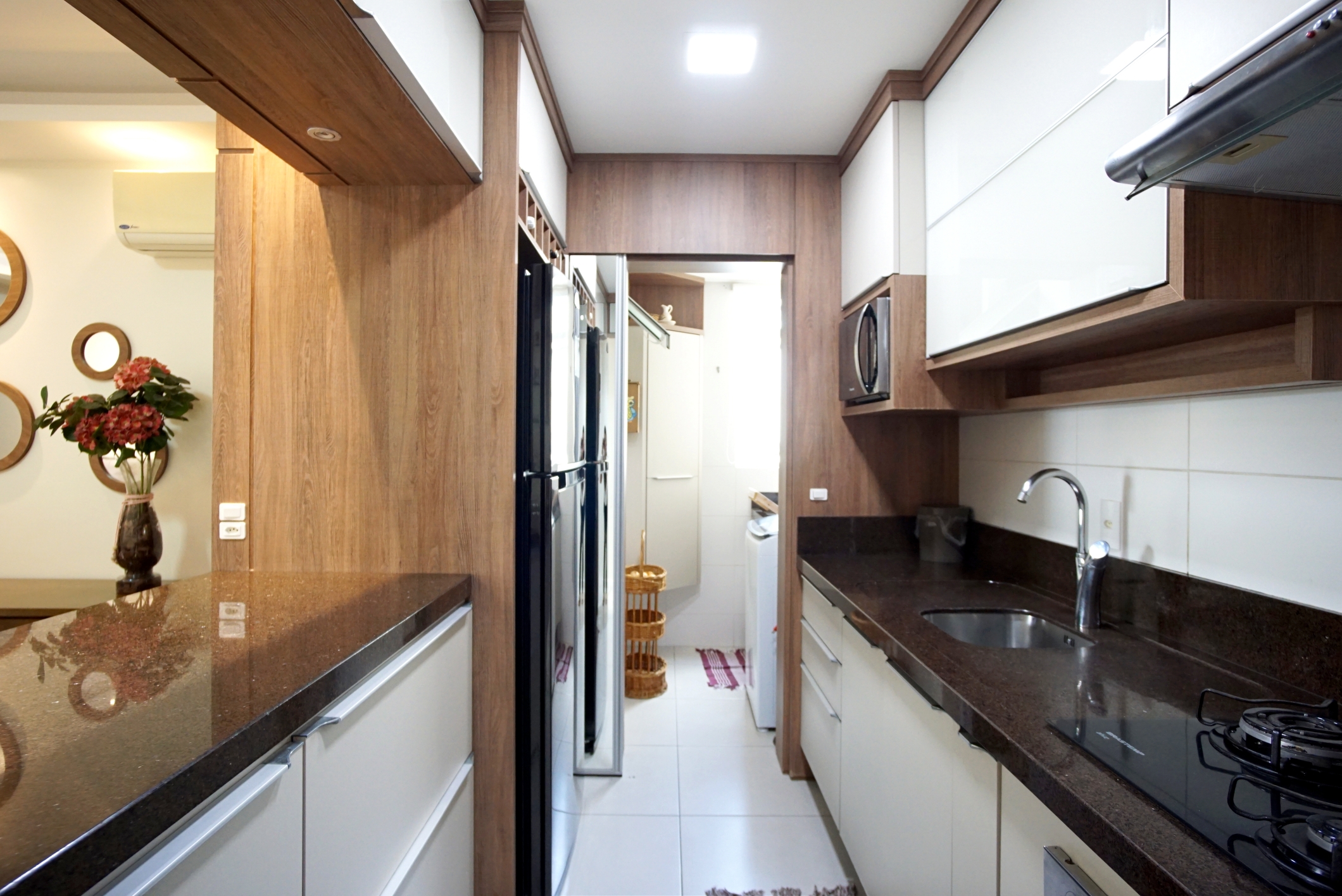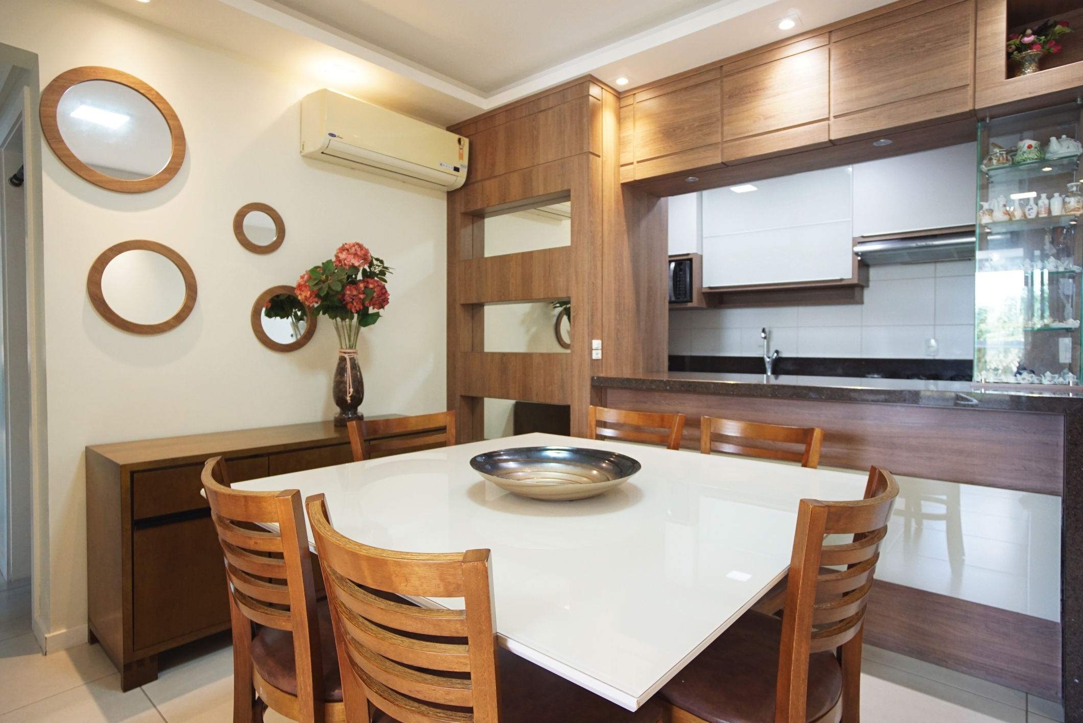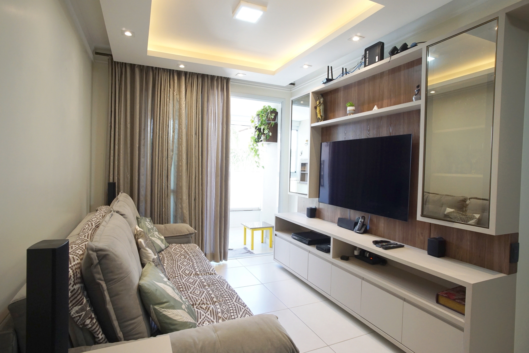 Apartamento possui sala de estar com TV a cabo, wi-fi, mesa de jantar e cervejeira. Sacada com churrasqueira e fechamento com vidros.