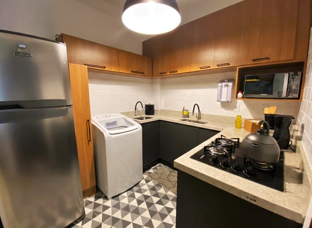 Apartamento com cozinha completa. Sala de estar com mesa de jantar 6 lugares, wi-fi e Smart TV. Sacada com vista LATERAL do mar.